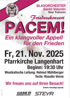 Unter dem Motto Pacem - Ein klangvoller Appell für den Frieden“ veranstaltete das Blasorchester Sankt Valentin Steyr Traktoren am 21. November 2025 um 19:30 Uhr in der Stadtpfarrkirche Langenhart ein Friedenskonzert.